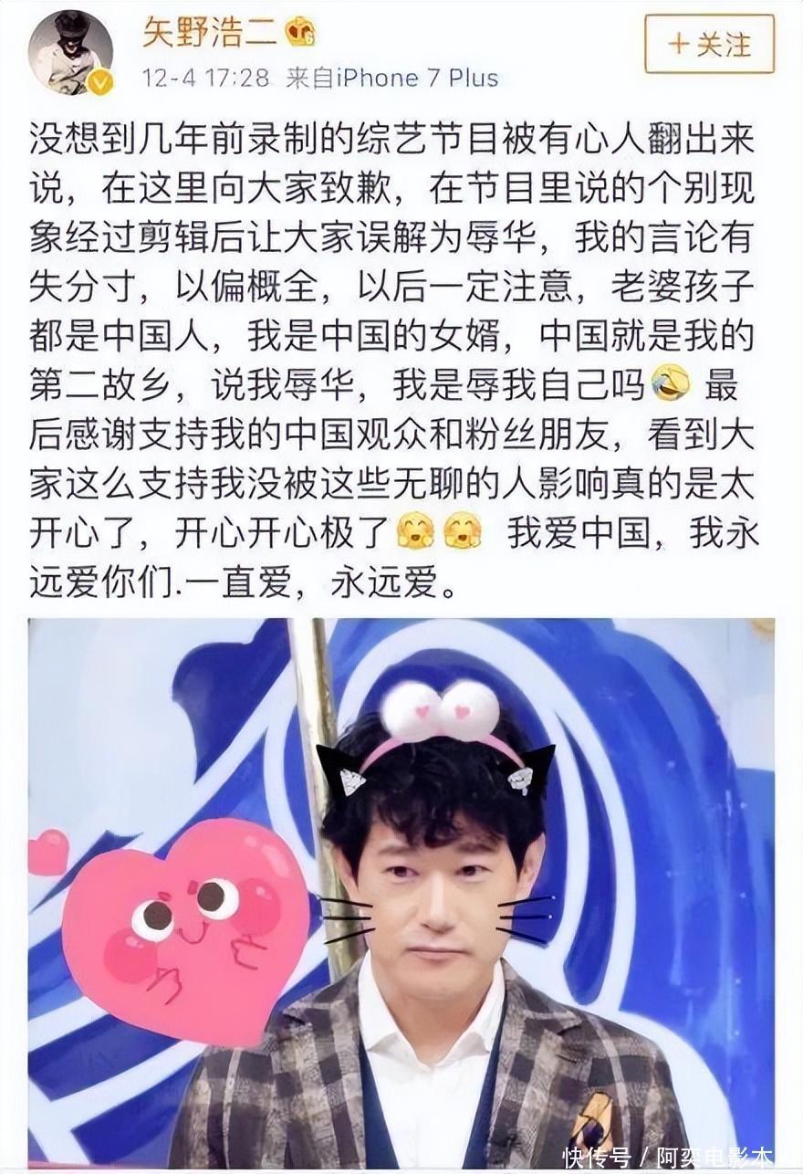更有甚至直接将他的这番言论说成了辱华,让他以后不要再来中国发展,眼看事情发展越来越不可控,矢野浩二赶忙出来道歉,表示自己非常爱中国,怎么可能“辱华”。