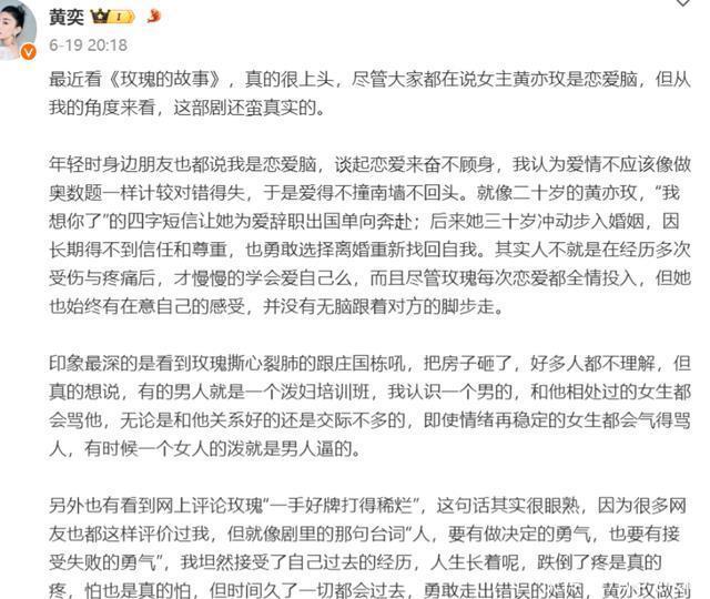 刘亦菲主演的电视剧《玫瑰的故事》热播,黄奕发微博长文抒发感慨,直言自己是个恋爱脑,引发网友讨论。
