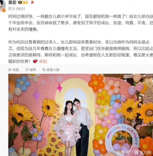 黄奕在微博晒出女儿小学毕业参加派对的照片,引发网友感慨时间飞逝。