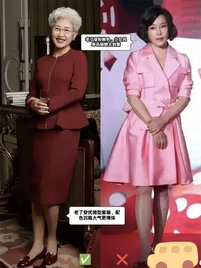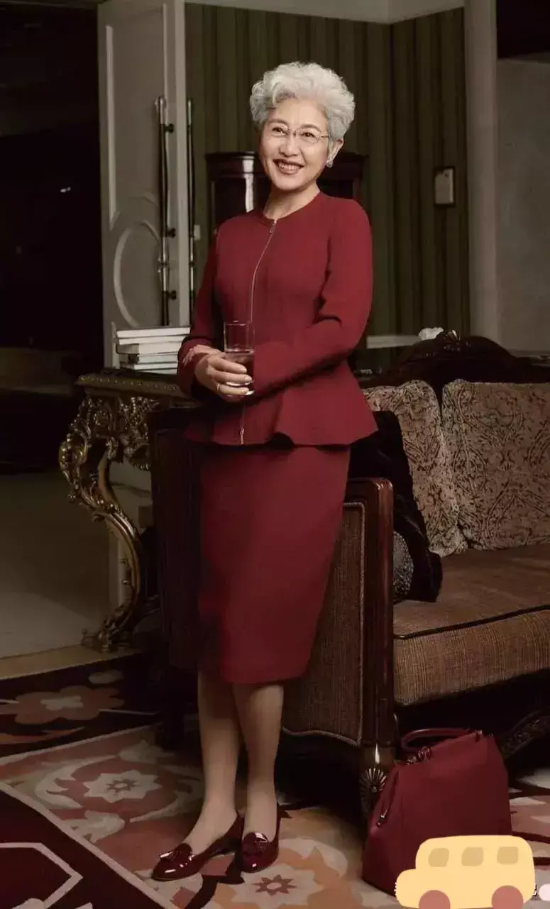 老了,穿粉嫩颜色的衣服单品想要可以装嫩,反而会显得土气廉价不高级。正确的来说,我们可以选择经典色的衣服产品,像71岁的傅莹穿的这一套中红色的裙装,这样的套装上身之后典雅大气,它的配色沉稳,而且很得体。