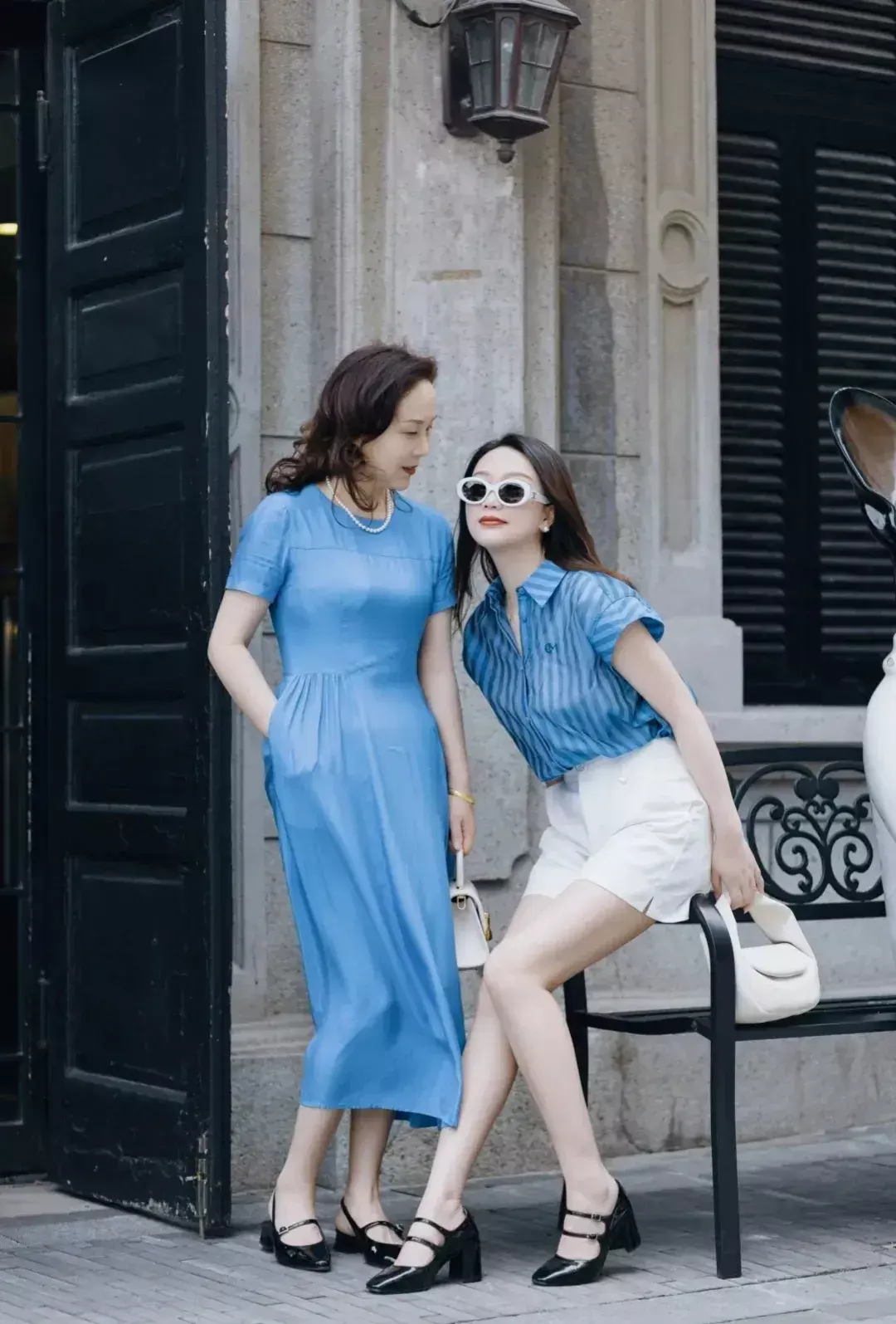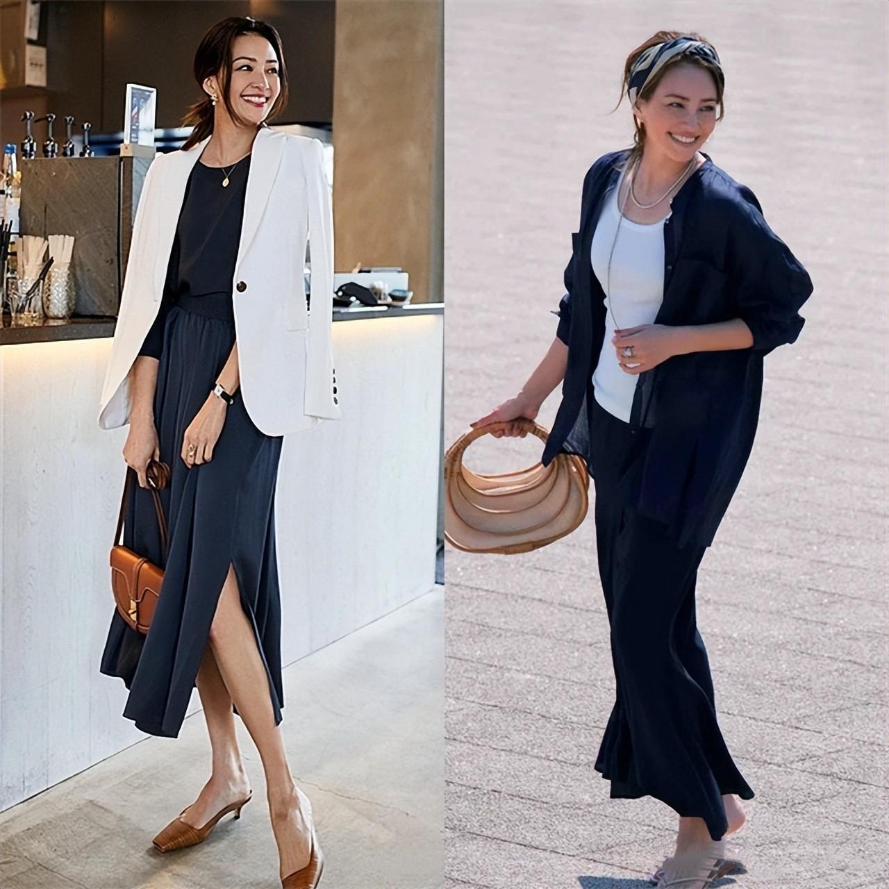 针对年龄比较大的女人来说,选择像下面这两位素人一样白色的西服外套,内搭黑色T恤和藏蓝色的开叉半身裙就够了,能够轻松打造出更加简约大方的穿衣造型。