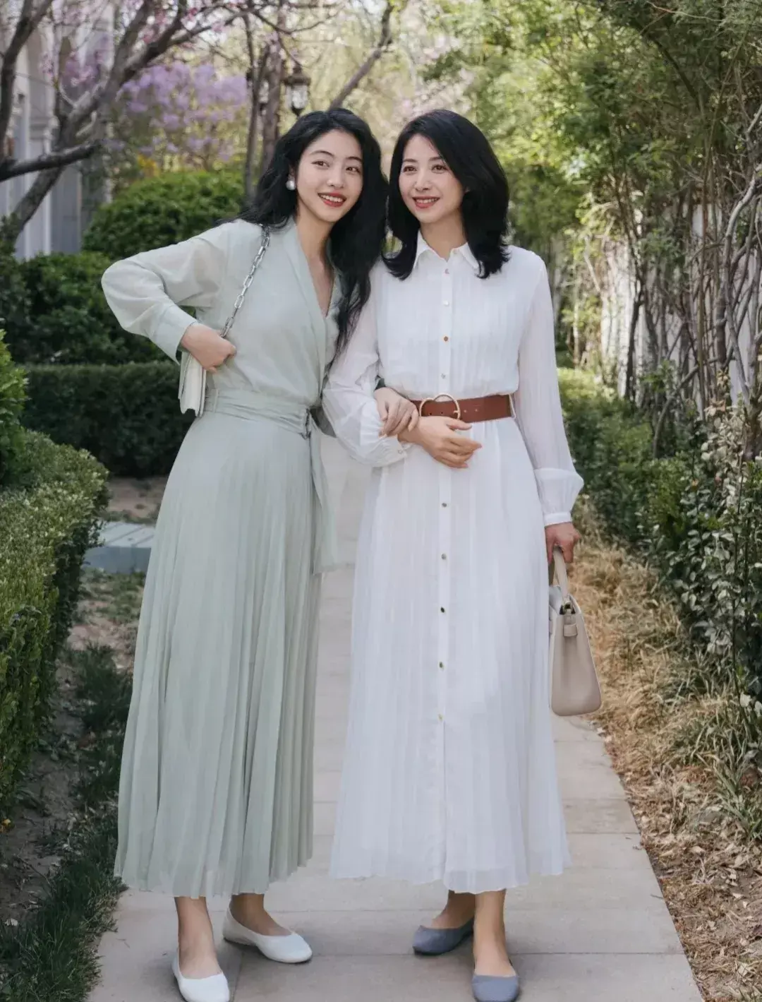 像下面这对母女穿搭造型示范就是一个很成功的案例,素人博主他妈妈穿的这一件白色的连衣裙,腰间加上棕色的宽腰带,而且这条连衣裙的面料比较薄,很适合这个夏季清凉还解暑。