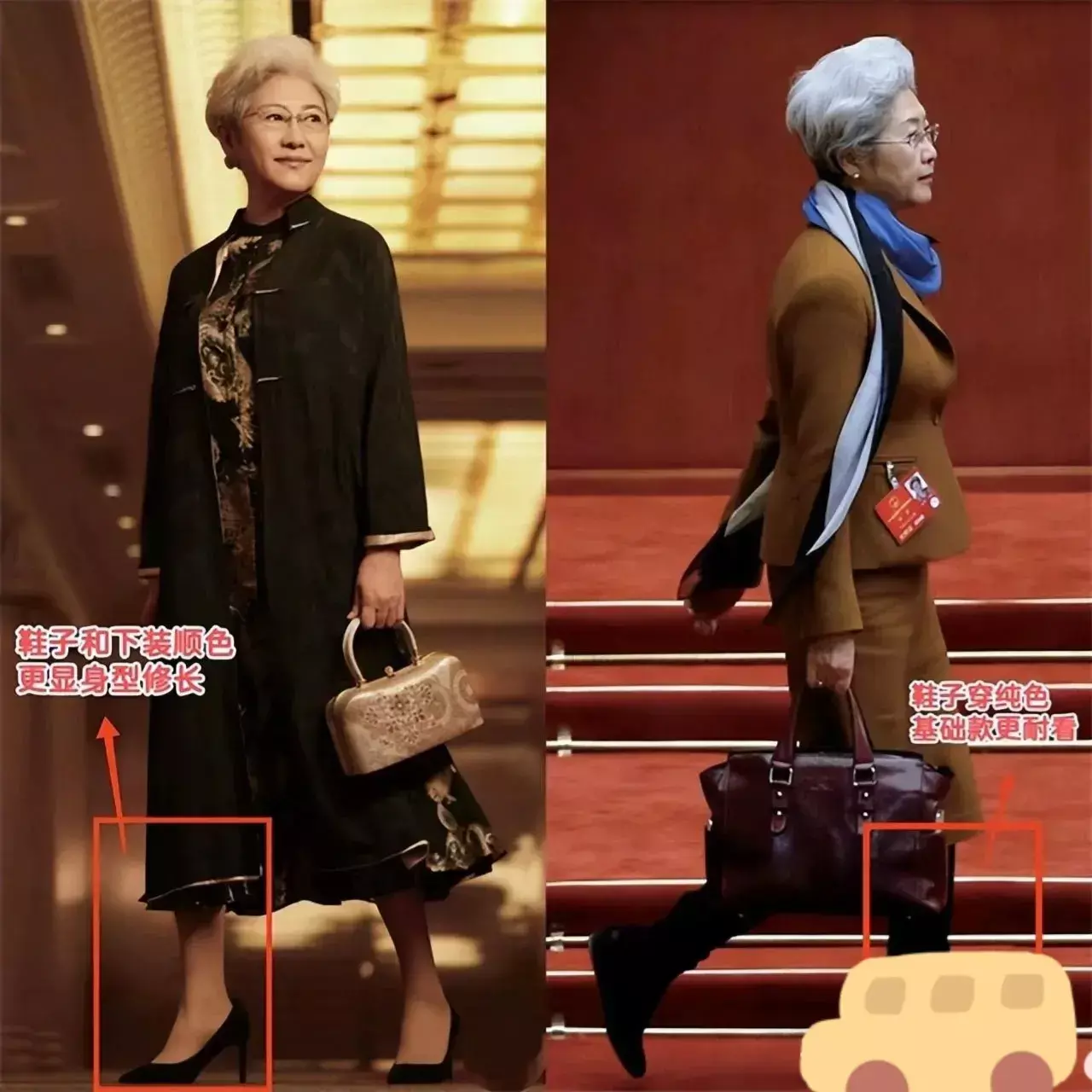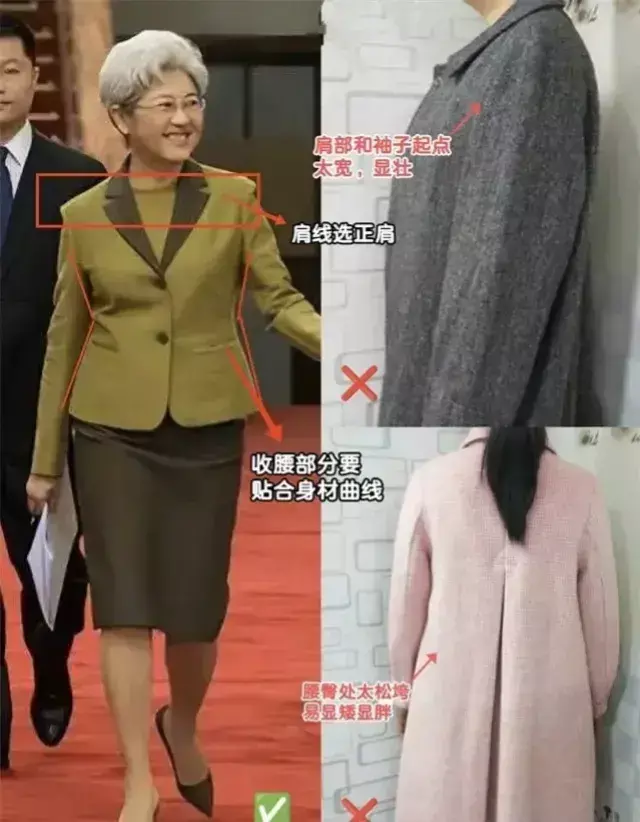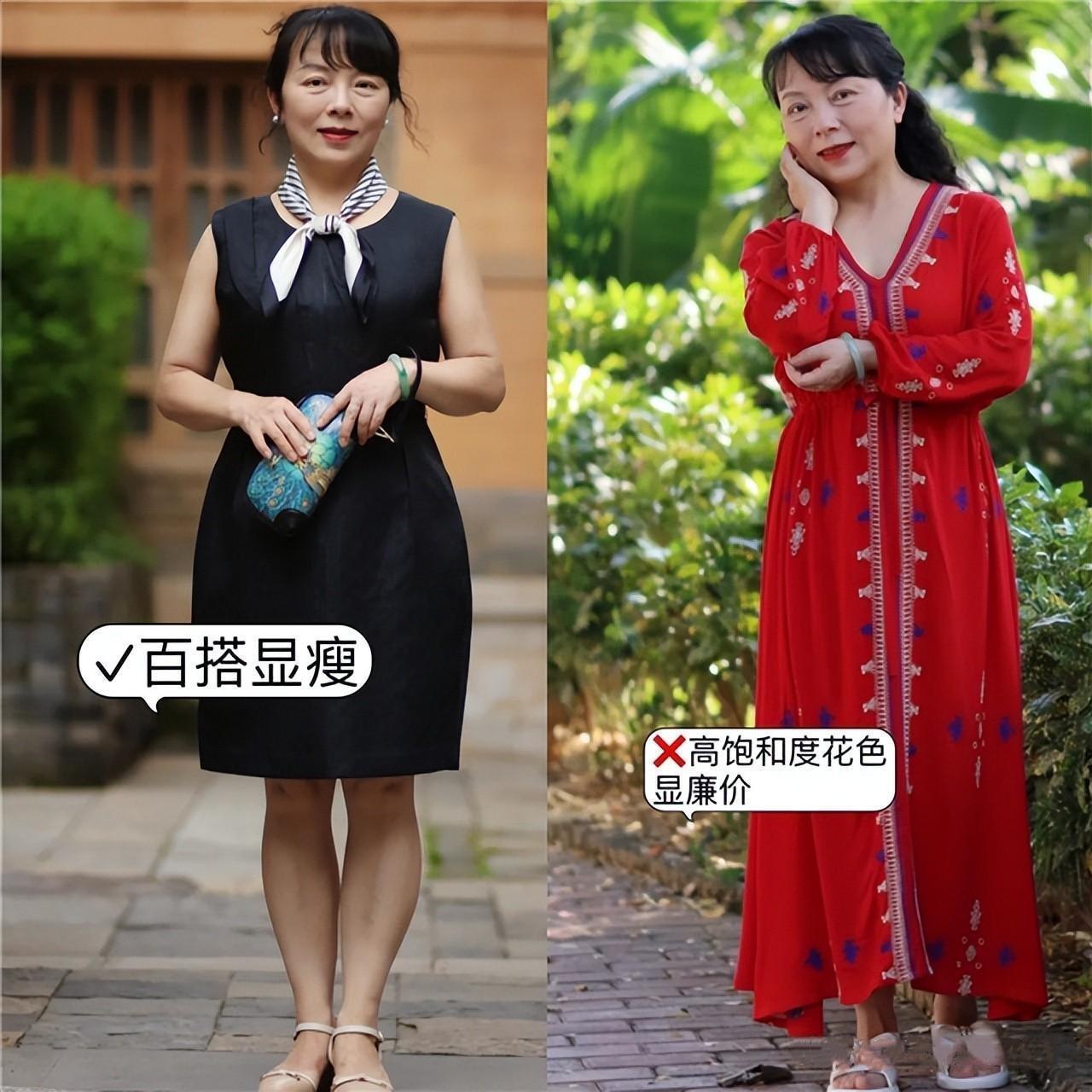 正确的穿法是靠高度减半,不能过高,能更好的修饰颈部线条,更显长也显气质。同时,裙摆选a字廓形,更修饰身材,毕竟到了中老年龄段,腰粗胯宽腿粗都是有可能的,利用衣服的版型把这些缺点都藏起来。