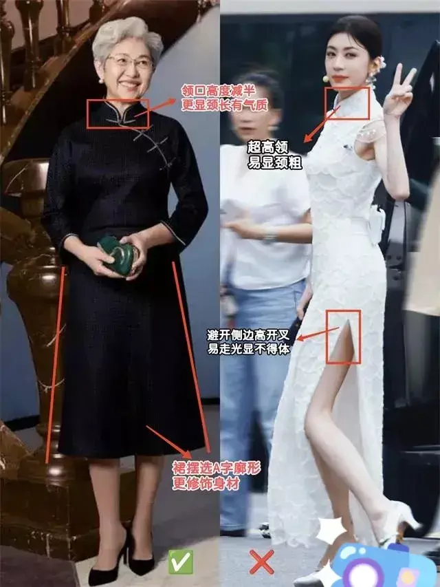 也不是说高开叉的连衣裙就不好看,但是不符合中老女性,同时,穿上有超高领的衣服单品,脖子显短不说,还会显粗。