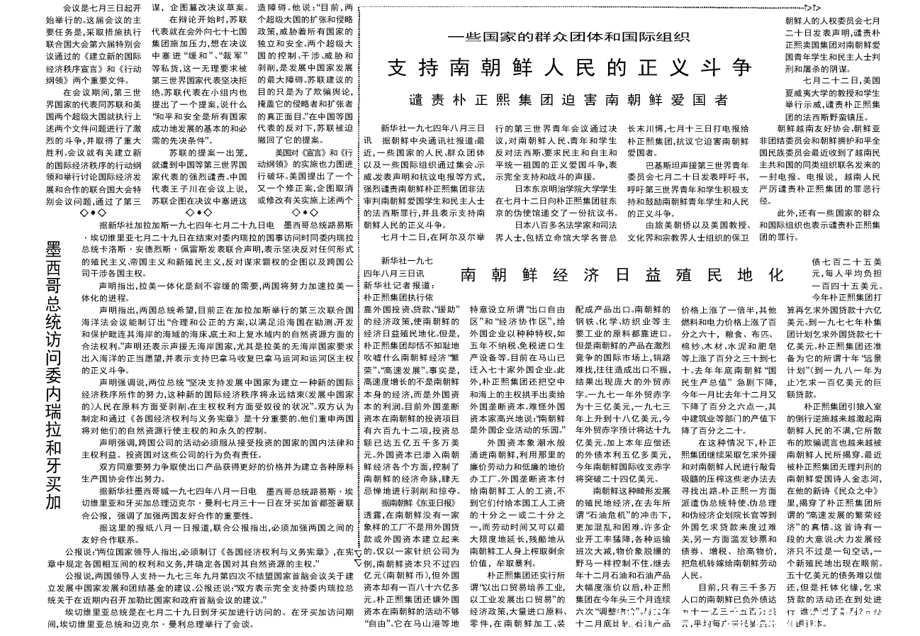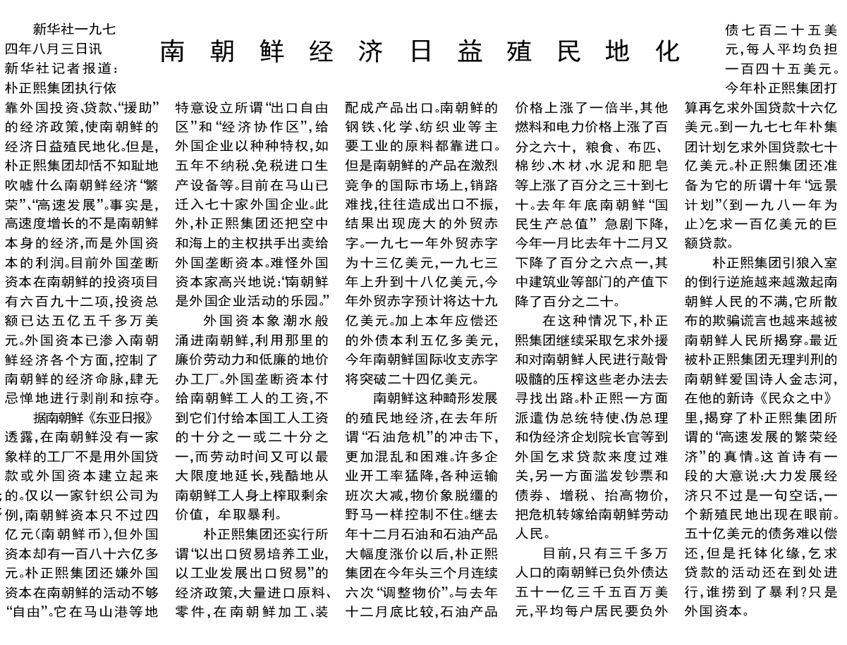 南朝鲜经济日益殖民地化 1974年8月4日《人民日报》