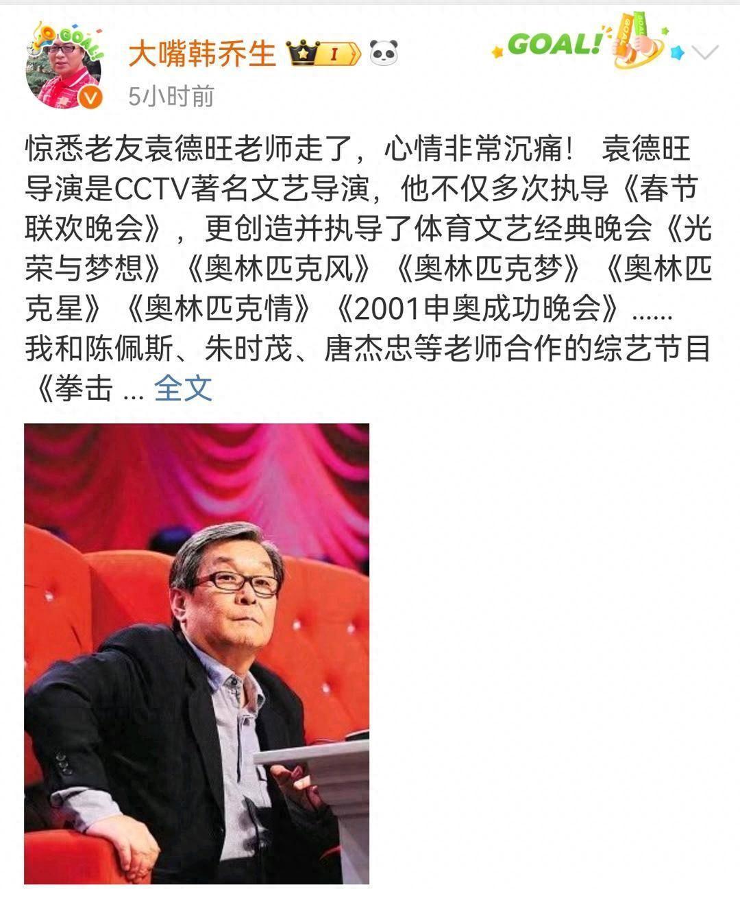 7月8日,中央电视台原体育播音员和解说员韩乔生发文透露,导演袁德旺因病在北京去世,享年77岁。袁德旺曾先后7次参与央视春晚导演工作,并担任过1997年和2004年的央视春晚总导演。袁德旺导演曾两度来宁执导曲艺牡丹奖颁奖晚会,记者从江苏曲艺人口中证实了他去世的消息。
