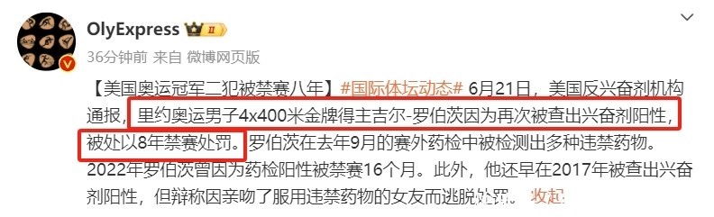 官宣!美国奥运冠军禁赛8年,多次陷禁药丑闻,曾用接吻逃避制裁