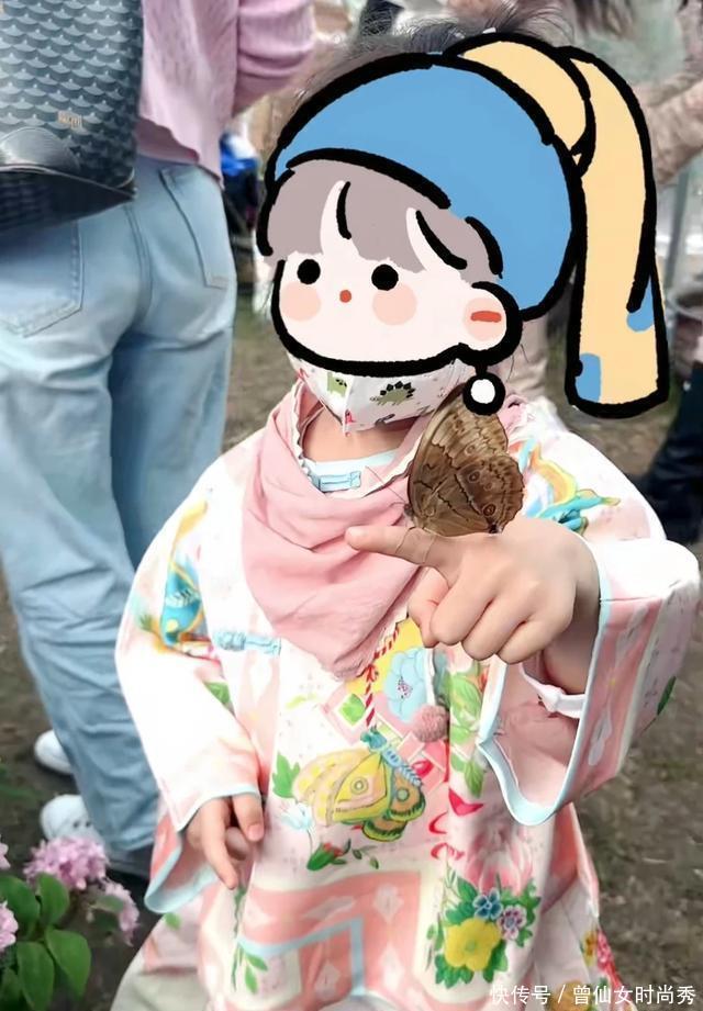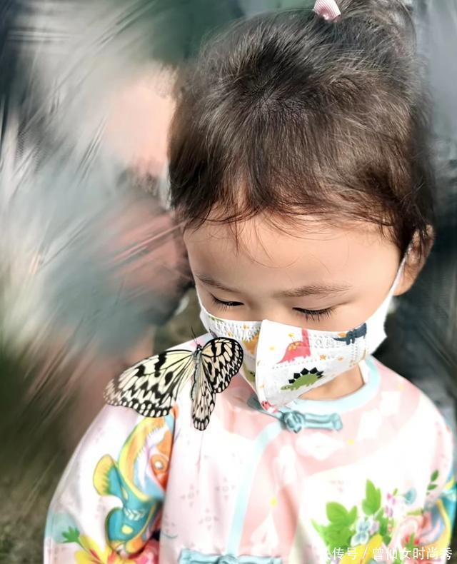 林峯3岁女儿Luna胆量比较大,对这些毛绒绒的美丽昆虫一点都不害怕,张馨月让女儿伸出手指接住蝴蝶,Luna很乖巧照着妈妈的话去做,小家伙穿着新中式外套特别甜美,脖子上粉色围兜更是可爱。