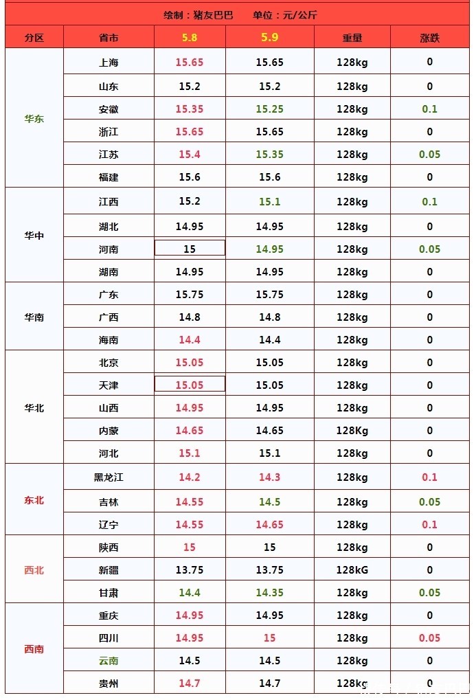 因此,基于市场多方因素,猪价呈现弱稳震荡的走势!从最新反馈来看,5月9日,猪价横盘14.86元/公斤,南北市场,猪价以弱稳调整为主,零星地区,猪价涨跌调整0.05~0.1元/公斤!