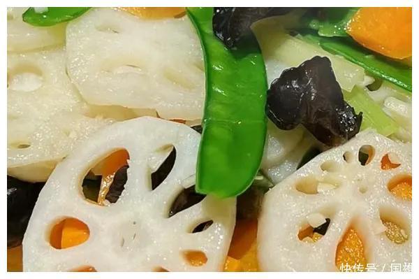 莲藕,荷兰豆,胡萝卜,黑木耳,芹菜,蒜末。