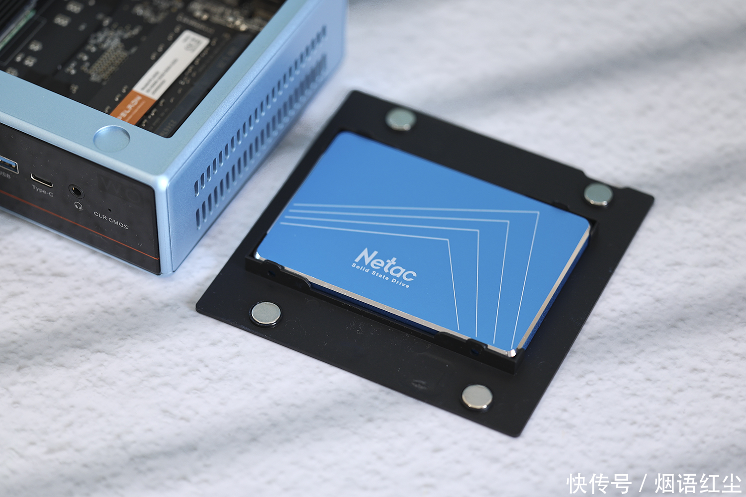 值得一提的是,磐镭WO4迷你主机在其顶盖上,还专门设置了硬盘固定槽,并随机附送了2.5英寸硬盘数据线,方便用户在不更换原机硬盘时扩容。刚好我手头有一块闲置的2.5英寸硬盘,掀开顶盖直接就可安装,小白用户都能轻松操作。