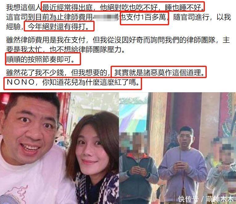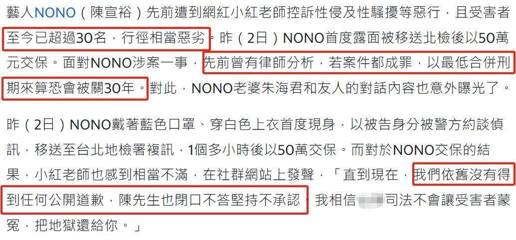 随着NONO的露面,有位资助受害人打官司的知情人站出来透露了案件最新进展,表示NONO最近得经常出庭,绝对吃也吃不好,睡也睡不好,案件一时半刻不会出最终结果,一整年都有得打,目前他一人就付出了上百万台币的律师费,折合人民币20多万,就是想给NONO一个教训。
