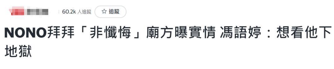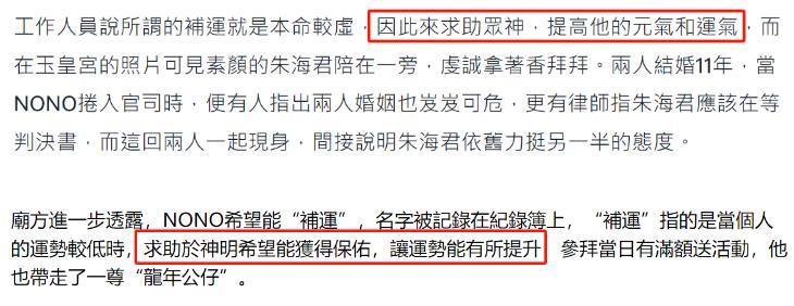 寺庙负责人出面接受了采访,否认了NONO去寺庙忏悔,透露他其实是去“补运”的,说白了,就是NONO觉得自己个人运势不好,去寺庙捐钱希望获得神明保佑提升运势。