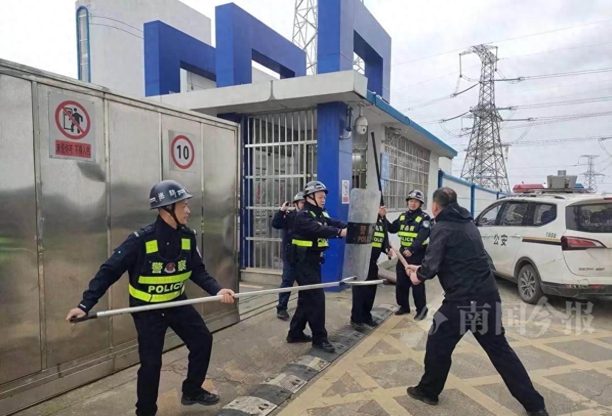 随后,一名人员扮演“歹徒”,手持木棒闯进加油站,“挟持”工作人员……