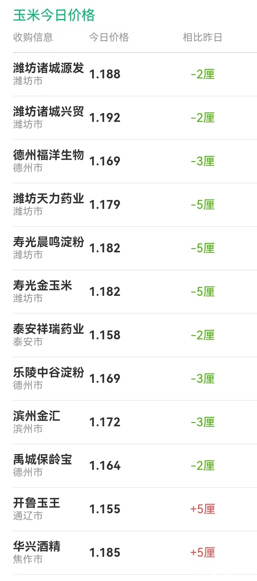 其中,山东地区,深加工门前到货超950车,山东多地企业挂牌价格下跌0.2~0.5分/斤,玉米现货价格在1.147~1.275元,主流深加工报价在1.16~1.22元/斤!