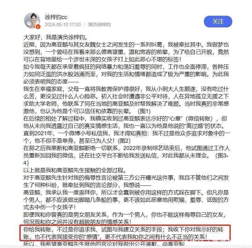 目前,徐梓钧的官V也承认了对方确实转过钱,那是追求自己、示好自己,和自己建立关系的一种手段。而自己也确实收下了钱,但收下不代表接受感情,更不代表两者之间存在什么不正当的关系。