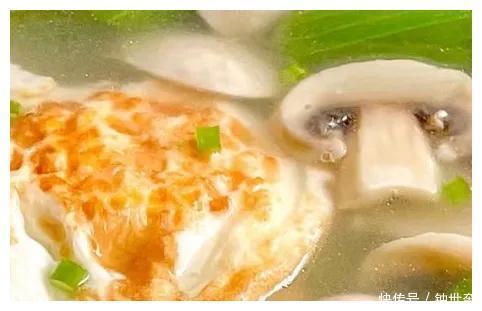 4、口蘑炒软炒出汁水后,加入适量清水,盖上盖子煮开,再放入荷包蛋煮三分钟。