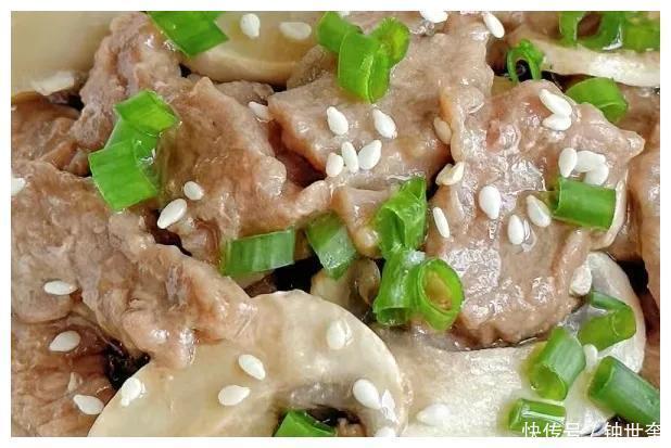4、口蘑牛肉蒸熟后取出来,撒上葱花和白芝麻点缀,就可以端上桌开吃了。