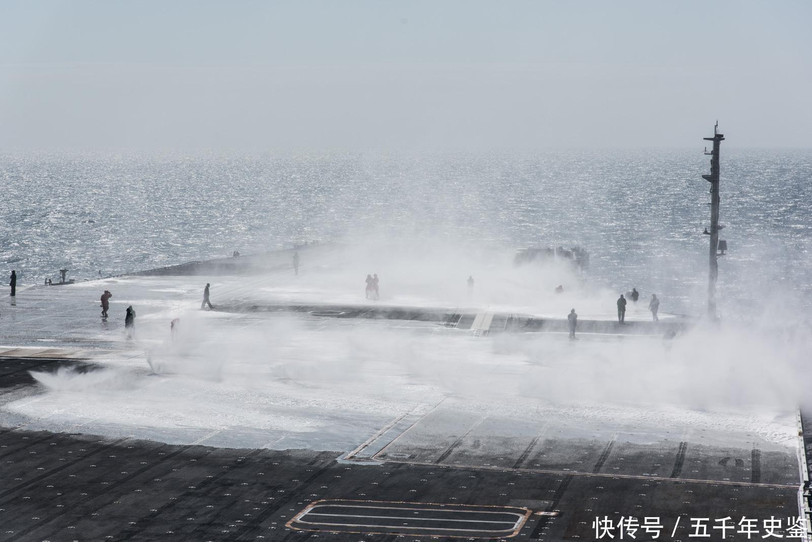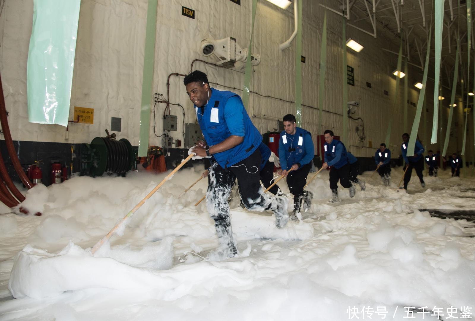 喷淋系统试验后,需要实施大量的机库清洗工作,这可是个体力活儿。有趣的是,在“福莱斯特”号航母以前,机库顶部喷淋系统用的是水。而在建造时就安装有水成膜泡沫灭火系统的第一艘美国航母,则是在“尼米兹”号上才实现的。