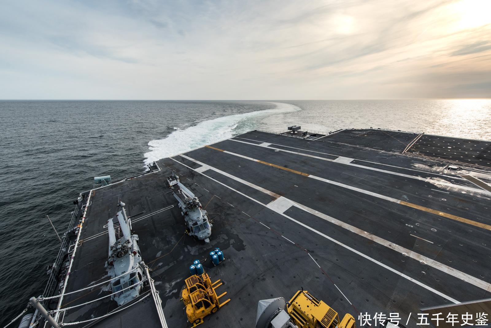 图为“福特”号高速转向时产生的尾流,非常壮观。这艘航母已经完成了建造商海试,在回港进行休整之后,又在2017年5月24日再次出港进行海试,即验收海试。这一次是验收海试,主要验证科目是“福特”号在海上进行作战的能力。在完成验收海试之后,它很快就会进入美国海军服役了。
