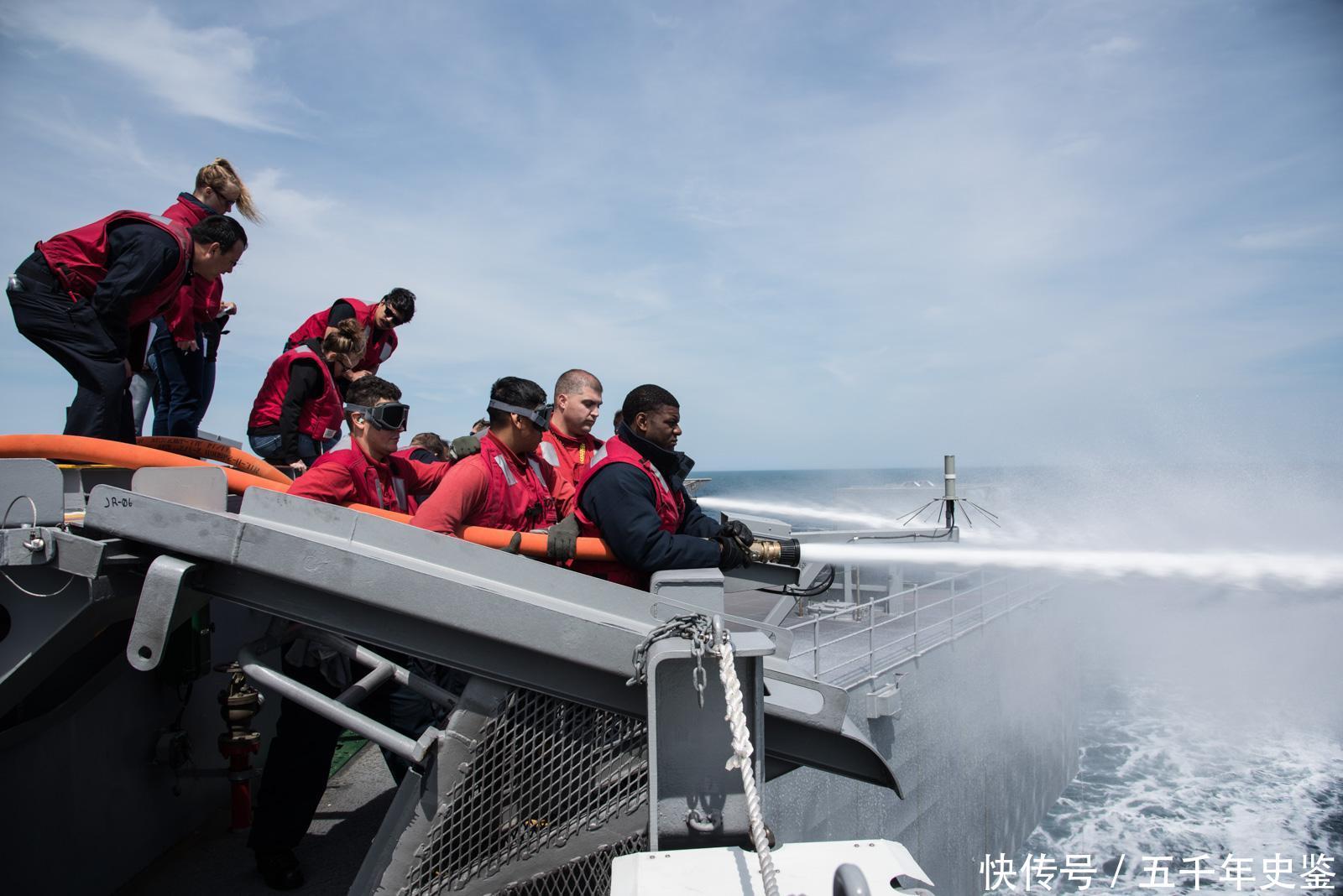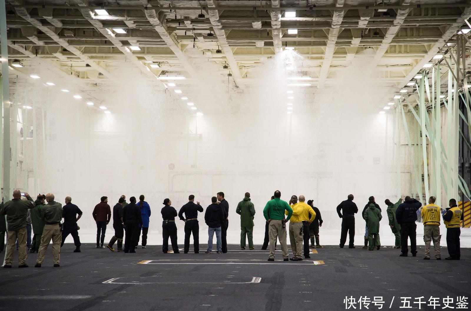 进行机库喷淋系统的测试。同飞行甲板也一样,机库对航母确保作战能力也非常重要。“福特”号航母的机库消防设备包括一套完整的顶部喷淋系统、消防软管站和移动消防车,能够起到很好的作用,且顶部喷淋系统用水成膜泡沫进行灭火。