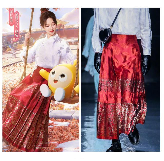 自去年开始,推陈出新的中式服装,得到了广泛的认可,杨幂、唐嫣、刘诗诗、杨紫等人都穿上了这一系列“摇旗呐喊”,其中不乏马面裙、苗绣等民族元素。