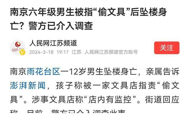 南京小学生被指偷文具后续:网传店主不依不饶,孩子跳楼自证清白