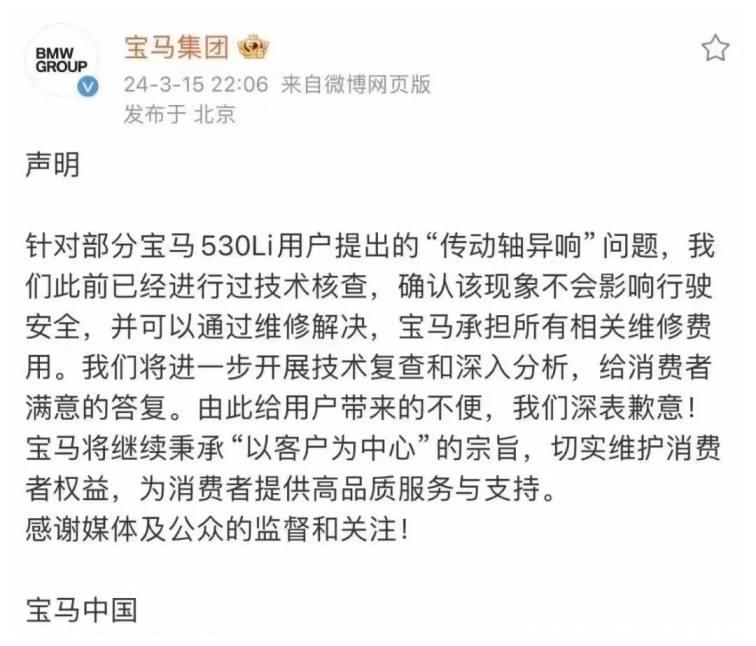 宝马530Li传动轴异响后续来了,市场监管总局严查,或面临召回?
