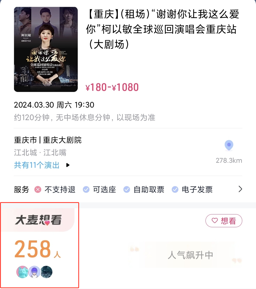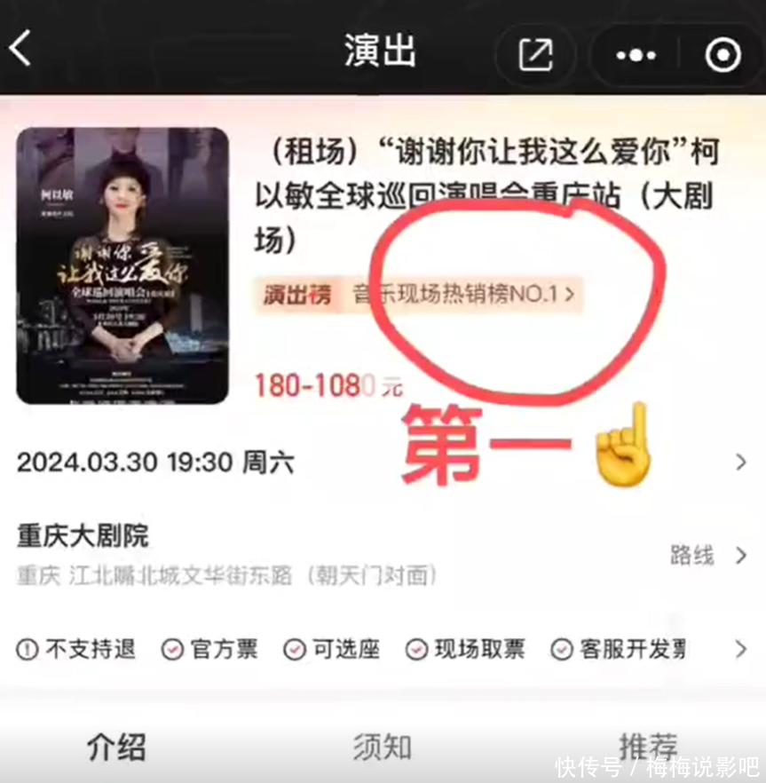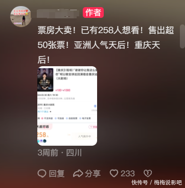 柯以敏的演唱会从2月底就开售了,直到现在也没多少人买,有营销给柯以敏打广告,他说:“票房大卖!已有258人想看!售出超50张票!亚洲人气天后!重庆天后!”