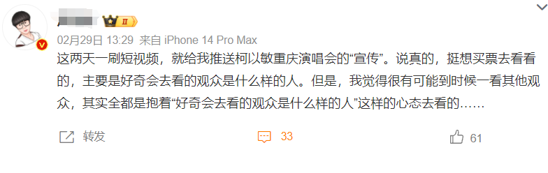 然后网友就好奇,网友说:“说真的,挺想买票去看看的,主要是好奇会去看的观众是什么样的人。但是我觉得很有可能到时候一看其他观众,其实全都是抱着‘好奇会去看的观众是什么样的人’这样的心态去看的。”