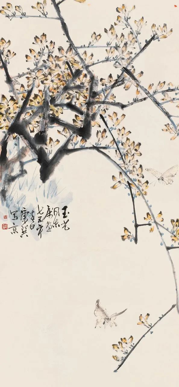 下面这幅《迎春图》,盛开的迎春花娇柔轻灵,给人以恬淡宁静、端庄秀丽之感。主干的线条虽然粗犷却不显粗糙,笔势稳重结实,细致的皴擦使枝干具有很强的立体效果。