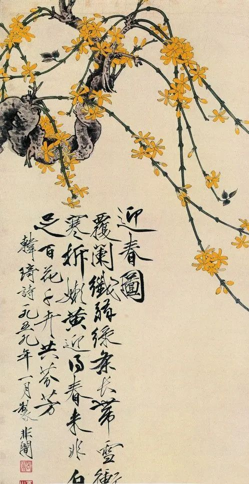 下面咱们一起来看看,国画大师们是如何用笔描绘迎春花的春意盎然吧!